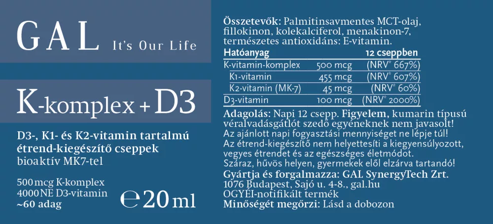 A GAL K2+D3 mostantól K-komplex+D3. A termék csak nevében változott, összetételében nem.Fönntartható gazdaságból származó MCT-olajban oldva, bioaktív MK-7-es, természetes „transz-” formában.