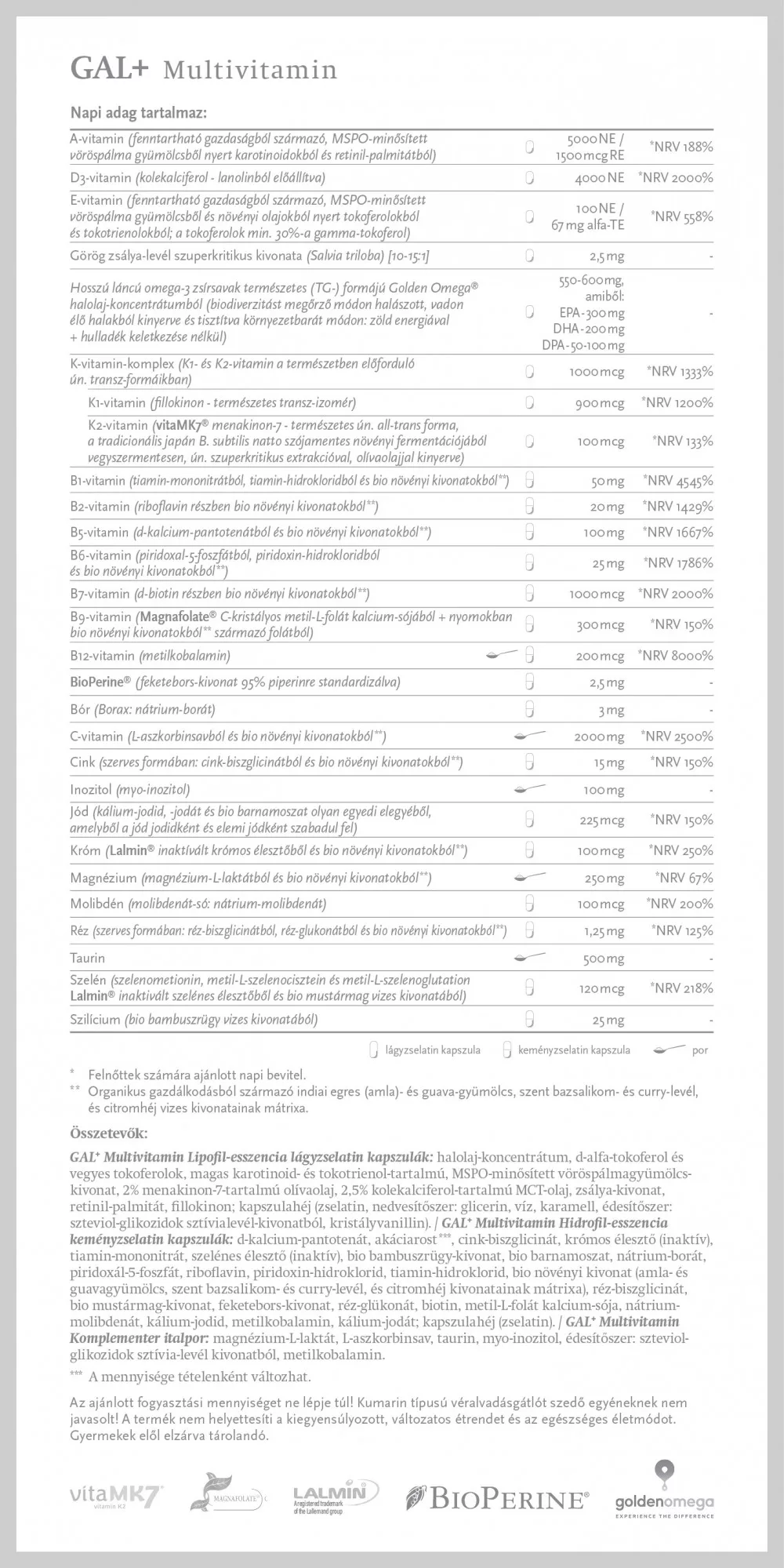 Bár minden felhasznált hatóanyagforma eleve kiváló felszívódással rendelkezik, azt Bioperine® feketebors-kivonattal is fokoztuk. Továbbá arra is ügyeltünk, hogy a vízoldékony és zsíroldékony összetevőket ne keverjük, hogy a számukra ideális hasznosulást és stabilitást biztosító módon lehessenek jelen, külön-külön:A vízoldékony (hidrofil) összetevők egy része keményzselatin kapszulában kapott helyet, a már említett növényi-kivonatok mátrixával, míg azon hatóanyagok, amelyek esetében az egyenletes napi elosztás optimálisabb, napközben kortyolgatható italhoz szolgáló, komplementer italporként vannak jelen.A zsíroldékony (lipofil) összetevők lágyzselatin kapszulába kerültek, GoldenOmega® halolaj-koncentrátumban oldva, természetes tokoferolokkal/tokotrienolokkal és görög zsálya-kivonattal stabilizálva.A szokásos multivitamin összetevőkön túl nagy mennyiségben tartalmaz magnéziumot, taurint, bambuszból nyert szilíciumot, K1- és K2-vitamint, valamint környezetbarát módon halászott és előállított, vadon élő apróhalakból származó, természetes (TG) formájú, hosszú láncú omega-3 zsírsavakat (EPA, DPA, DHA) is.A B9-vitamint a szervezetünkben is megtalálható, aktív metil-folát formájában tartalmazza, annak is a legstabilabb, ún. C-kristály szerkezetű kalcium-sójaként; ez a Magnafolate®, amely még a metil-folát glükozamin-sójánál is stabilabb.Napi adag: 1 db Lipofil olajkapszula (barna) + 2 db Hidrofil porkapszula (narancssárga) + 5 ml (4,4 g) komplementer italpor.Felhasználási javaslat:Lipofil olaj- és Hidrofil por-kapszulák: Étkezés közben, pár korty folyadékkal bevehetők, lehetőleg a reggelinél vagy ebédnél, s ne a vacsoránál. Bevehető mindhárom kapszula egyszerre, de a magas vitamin- és ásványianyag-tartalom miatt előnyös a két egyforma hidrofil kapszulát egy-egy étkezésnél bevenni, az emésztőrendszeri diszkomfort-érzést így az arra érzékenyek is elkerülhetik.Komplementer italpor: Folyadékban oldandó. Bár egyszerre is megiható, a hasznosulás maximalizálásához előnyösebb több részletben. Feloldás után 8 órán belül érdemes elfogyasztani, célszerű hát reggel és délután készíteni 1-1 adagot, 2,5-2,5 ml porból. Napközben így kényelmesen elkortyolgatható.A termékből kikerült a Kolin, mivel a visszajelzésekből származó tapasztalatunk, és a kolinnal kapcsolatos újabb vizsgálatok is egy irányba mutatnak: a kolin-kiegészítés fajtája és módja egyénenként eltérően optimális. Van, akinek a lecitin, másnak a kolin-só vagy egyéb kolin-forrás a legmegfelelőbb, illetve pl. bőséges quinoa- és/vagy tojássárgája-/májfogyasztás mellett akár fölösleges is pótolni. Minderről bővebben olvashat, és az egyéni kolinszükségletét is megismerheti a kolin.gal.hu oldalunkon.Összefoglalva: Beszedhető minden (kapszulák + italpor) egyszerre is bármelyik főétkezéskor, de ha az emésztőrendszere érzékeny és/vagy a maximumot szeretné kihozni a termékből, akkor érdemes az említett módokon, több részletben szedniAz ajánlott fogyasztási mennyiséget ne lépje túl! A termék nem helyettesíti a kiegyensúlyozott, változatos étrendet és az egészséges életmódot. Gyermekek elől elzárva tárolandó