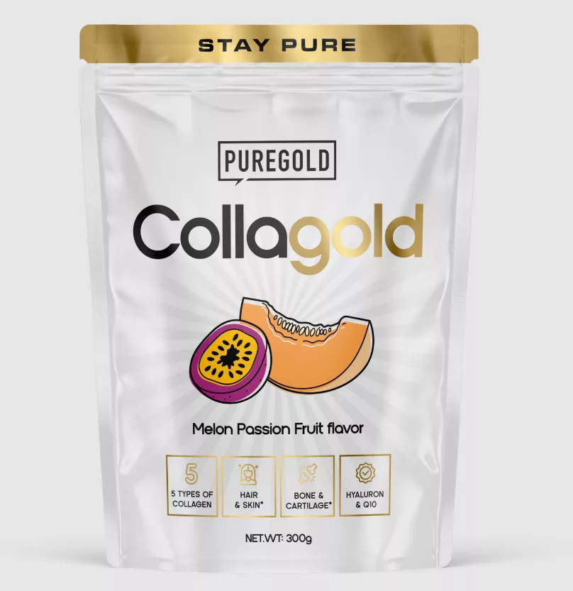 Pure Gold CollaGold ízesített hidrolizált marha és tengeri halkollagén italpor hozzáadott hidrolizált csirkeporc porral, tojáshéjhártya-hidrolizátummal, vitaminokkal, cinkkel, szelénnel és édesítőszerekkel.
