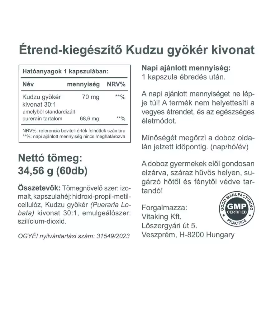A kudzu gyökér (Pueraria lobata) a hagyományos kínai gyógyászat kedvenc gyógynövénye. Menopauza idején alkalmazzák leginkább. Ez a Vitaking termék 70mg kivonatot tartalmaz (30:1), 2000mg kudzu gyökérből amelyből standardizált purerain tartalom 68,6 mg